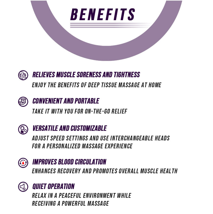 - Deep tissue massage: delivers powerful percussive therapy that targets sore and stiff muscles, relieves pain, and improves blood circulation.